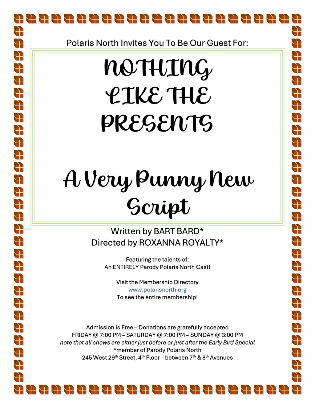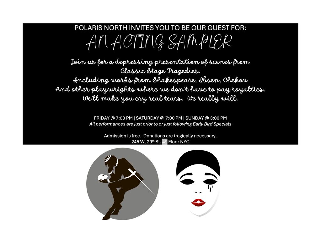Come to see a new play with an entirely Parody Polaris North Cast! Check their bios in our Membership Directory on this very same website!